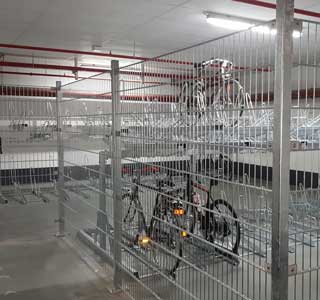 - Voor het Europa-Center Trineo kantorencomplex in Essen kregen we het verzoek om een deel van de parkeergarage af te sluiten en in te richten als fietsparkeerplaats. Een op maat gemaakt hekwerk sluit de parkeerplek voor fietsen af. Om zoveel mogelijk fietsen te kunnen plaatsen werd voor het FalcoLevel Eco etage-fietsenrek gekozen.