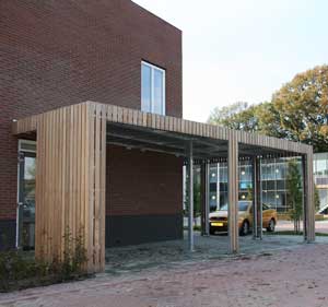 - Deze overkapping uit de FalcoLok serie is op maat gemaakt en wordt ingezet als fietsenstalling, met een gelijke doorloop naar de entree van het gebouw. De constructie is ontworpen en geproduceerd in eigen werkplaats en geplaatst door eigen Falco monteurs bij de Stichting Baalderborg in Slagharen.