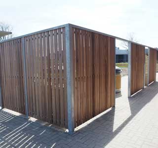 Er zijn allerlei mogelijkheden met de overkappingen van Falco. Laat het dak weg en er onstaat een terreinafscheiding/schutting. Er kunnen terreinafscheidingen worden gemaakt zodat de berging of overkapping breed inzetbaar is voor o.a. de opslag van containers, als afscherming van een gebouw of als doorloop naar de entree van een gebouw.