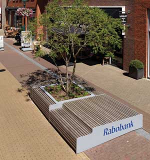Gebaseerd op de FalcoLinea XXL, zijn deze op maat gemaakte bankelementen voor het centrum van Barneveld ontworpen, geproduceerd en geplaatst. In een aantal zitelementen is een plantenbak een geïntegreerd onderdeel. De letters van donateur Rabobank zijn door Falco met een plasmasnijder in een zijvak opgenomen, in Rabobank blauw. De staalconstructie van al het straatmeubilair is gepoedercoat in telegrijs, RAL 7045. Ook het poedercoaten vindt plaats in onze eigen fabriek.