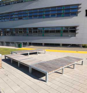 Ook de FalcoBloc serie leent zich voor op maat gemaakt straatmeubilair. Hieronder twee voorbeelden die op een schoolplein zijn geplaats. Eerst een lage FalcoBloc tafel/poef met een lengte van 4 meter. Geplaatst bij het Alkwin College in Uithoorn. Daaronder de FalcoBloc uitgevoerd als Tribunebank in verschillende niveaus. Geplaatst bij het rsg Wiringherlant in Wieringerwerf.