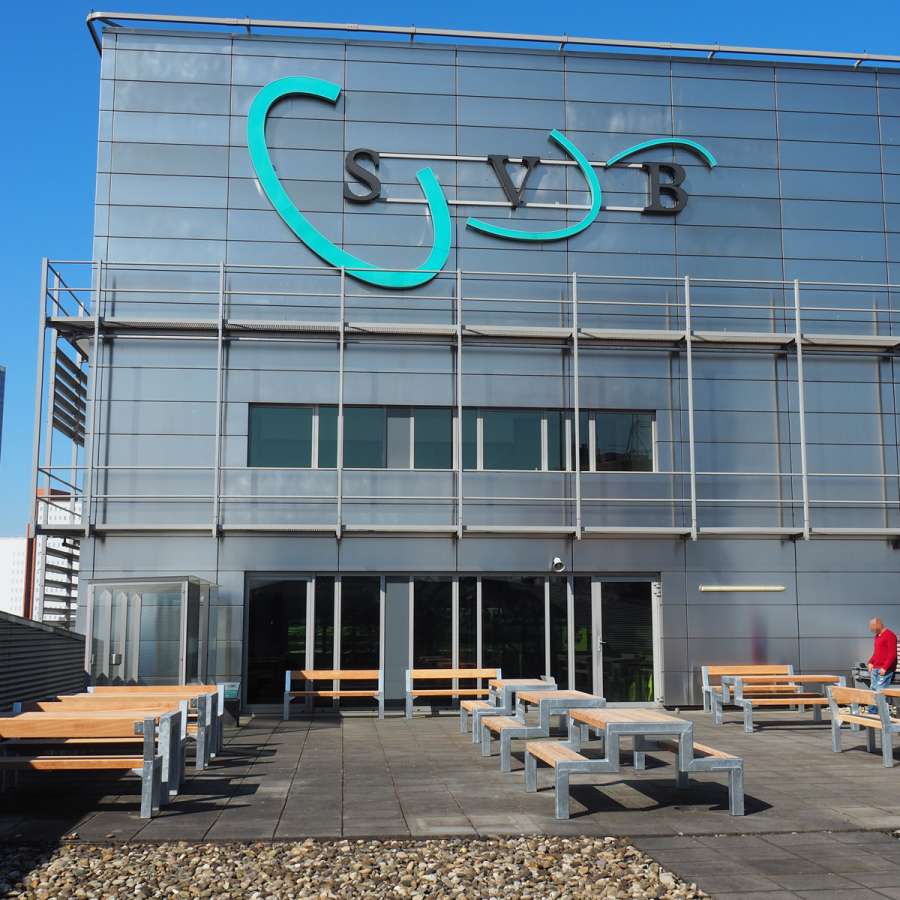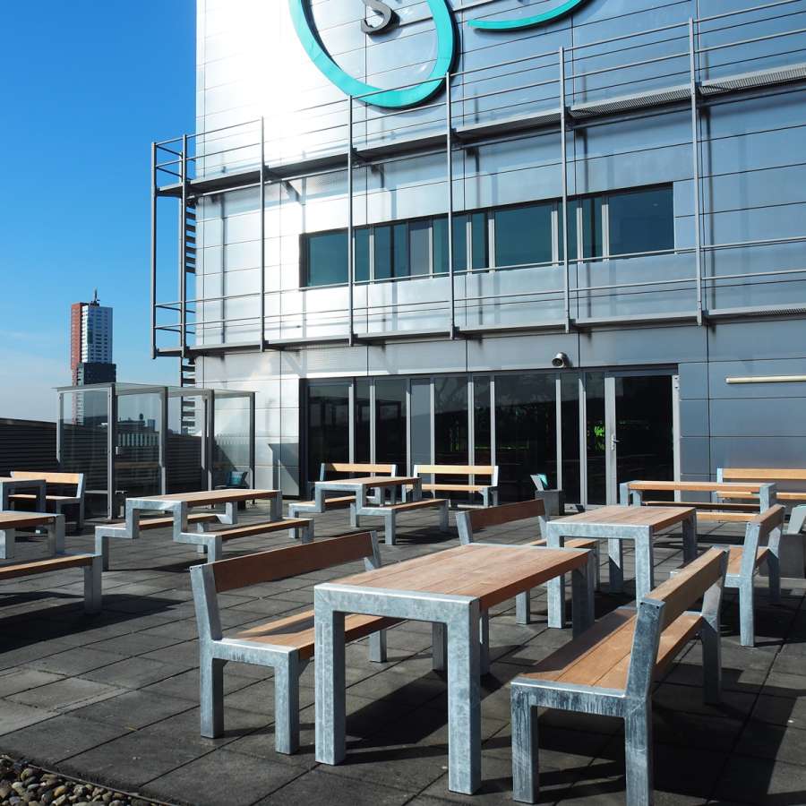 De Sociale Verzekeringsbank (SVB) op de Kop van Zuid in Rotterdam bestaat uit twee haaks op elkaar staande volumes, één van elf verdiepingen en een iets langgerekter deel van acht verdiepingen. Op het dakterras van het langgerekte gebouw staan deze picknicktafels uit de productlijn FalcoBloc.