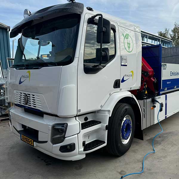 Wij bij Falco blijven voortdurend investeren in duurzame ontwikkelingen om onze ecologische voetafdruk te verkleinen. Een van de meest recente stappen in onze duurzaamheidsreis is de introductie van een volledig elektrische vrachtwagen in ons wagenpark. Deze nieuwe vrachtwagen vervangt een traditionele dieselvariant en ondersteunt onze ambitie om volledig zero-emissie te opereren.