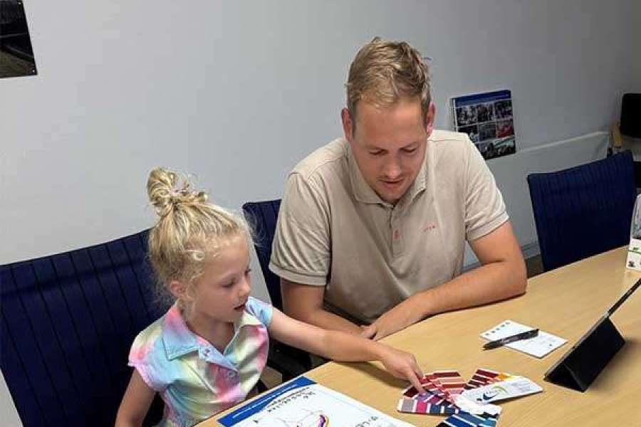 Afgelopen week kwam de 4-jarige Jet uit Borne samen met haar ouders op bezoek bij Falco in Vriezenveen. Jet won dit jaar de ontwerpwedstrijd tijdens RandRock Junior met haar kleurrijke en opvallende ontwerp: de Regenboogbank. Tijdens haar bezoek legde ze vol overtuiging uit aan onze ontwerper Robin Bolte hoe haar bank eruit moet komen te zien.