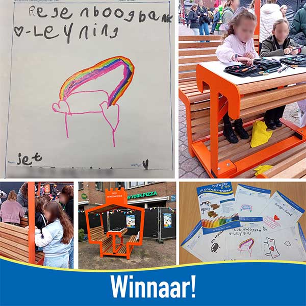 Jet’s ontwerp viel op door de vrolijke boog in regenboogkleuren boven de zitting. De komende periode gaan we, net als vorig jaar bij Savi’s Goalbank, samen met Jet en haar ouders het ontwerp verder uitwerken en de Regenboogbank realiseren in onze eigen fabriek in Vriezenveen.