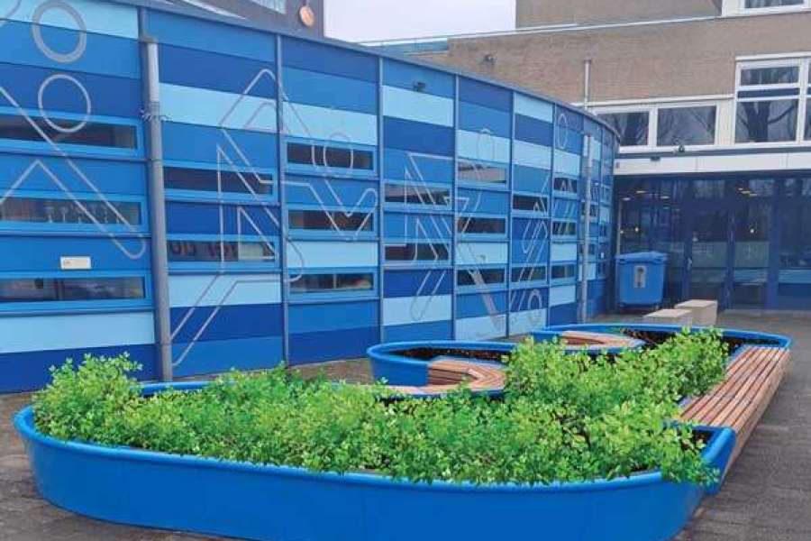 In dit geval is gekozen voor een hemelsblauwe (RAL 5015) uitvoering, die aansluit bij de huisstijl van de opdrachtgever. De bank is geplaatst op het schoolplein van OSG Willem Blaeu in Alkmaar. Direct na de montage, uitgevoerd door onze eigen VCA-gecertificeerde monteurs, zijn er foto’s gemaakt om alvast een indruk te geven van het eindresultaat. Omdat er op dat moment nog geen beplanting aanwezig was, hebben we de eerste afbeelding met behulp van AI bewerkt. Zo is goed te zien hoe de boombank er uit kan zien in een groene setting met bijvoorbeeld siergrassen of heesters.