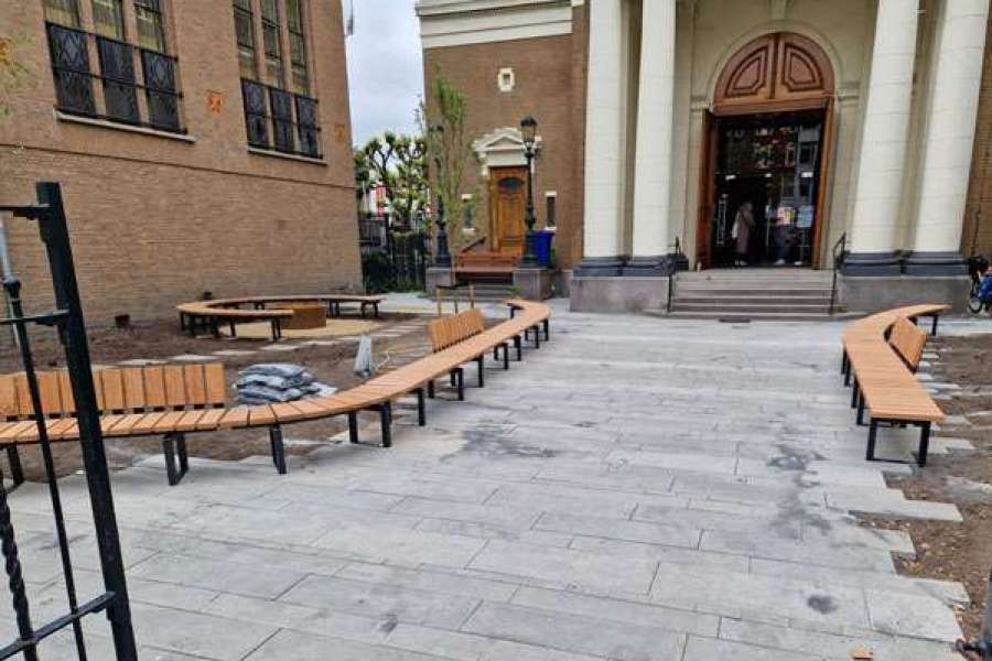 In opdracht van Diemel Groenvoorzieningen zijn recent prachtige nieuwe zitplekken gerealiseerd bij de Paradijskerk in Rotterdam. Rondom de monumentale kerk zijn verschillende uitvoeringen van onze FalcoSinus banken geplaatst, die samen een aantal sfeervolle en functionele zitplekken vormen.