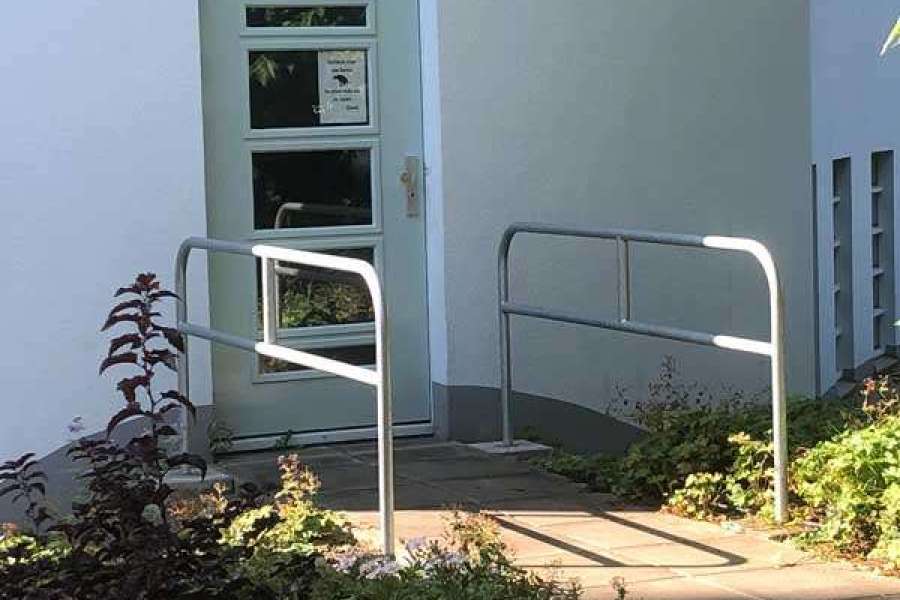 Aan de ingang van de kerk staan twee geleidebeugels met tussenbuis, die bezoekers op een gastvrije manier verwelkomen en de route naar de ingang markeren. Langs het sierlijke pad dat naar de ingang leidt, vind je eveneens geleidebeugels met tussenbuis, die een harmonieuze en gestructureerde benadering van de kerk mogelijk maken.