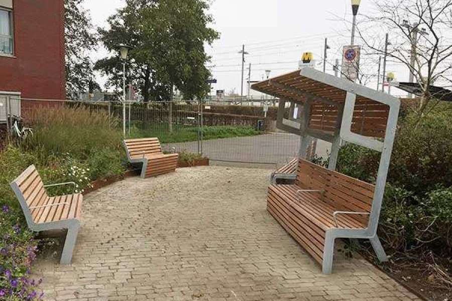 Een speciale uitvoering van de FalcoLinea is geplaatst met een geïntegreerd afdakje, zodat bewoners en bezoekers beschut kunnen zitten. Deze banken met overkapping bieden een ideale oplossing voor een comfortabele pauze in de buitenlucht, ongeacht het weer.